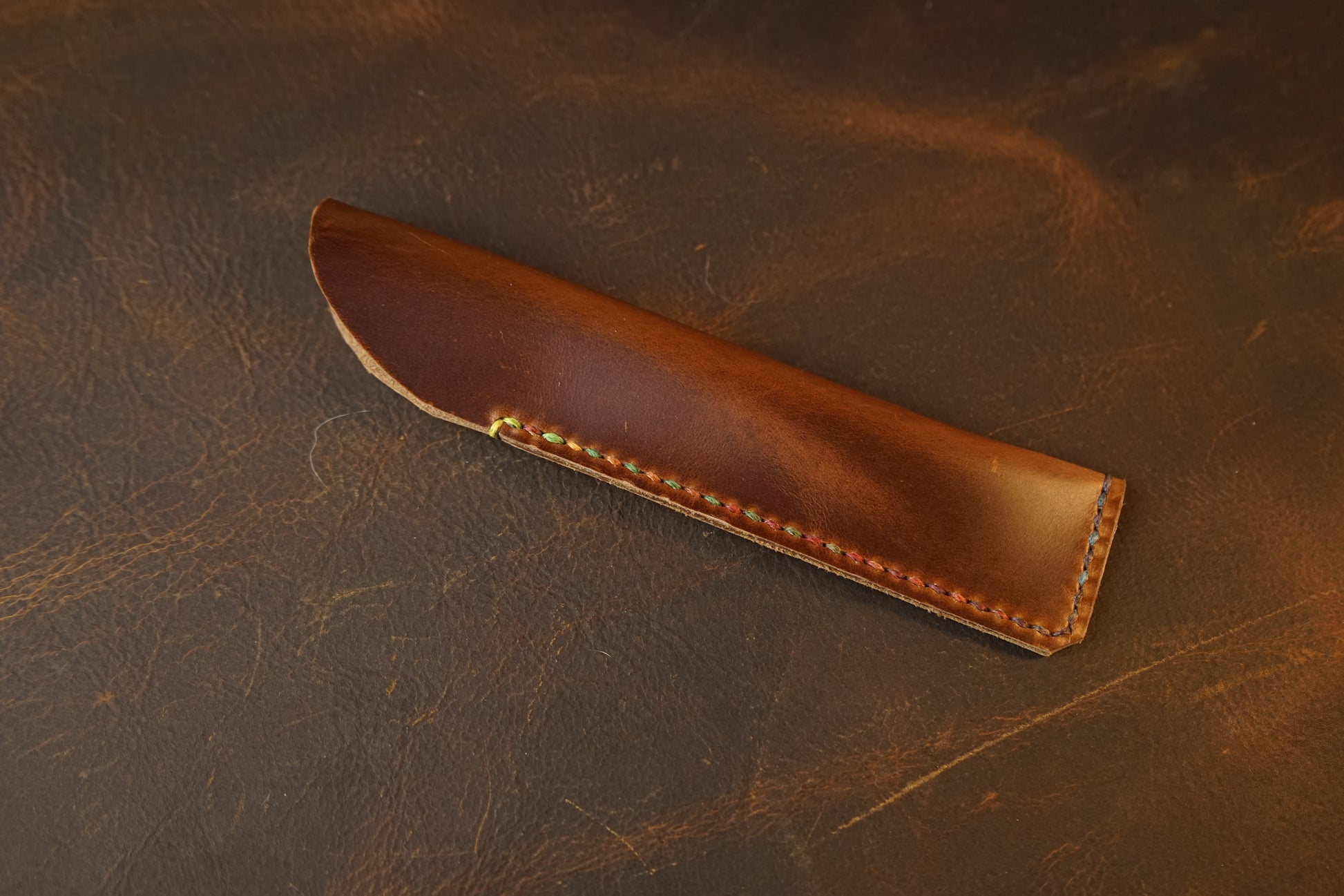 Our single pen sleeve is made in house with a 3-4 oz chromexcel type leather. It is hand cut, hand punched, and hand stitched with a long lasting multicolored thread. Holds most fountain pens.